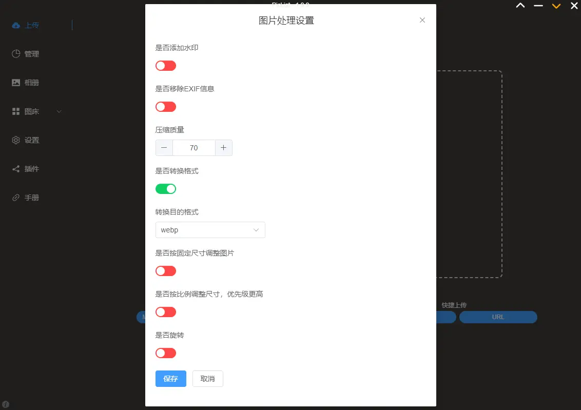 - 可以进行图片处理,自动压缩并转为webp,让我可以少用一个软件